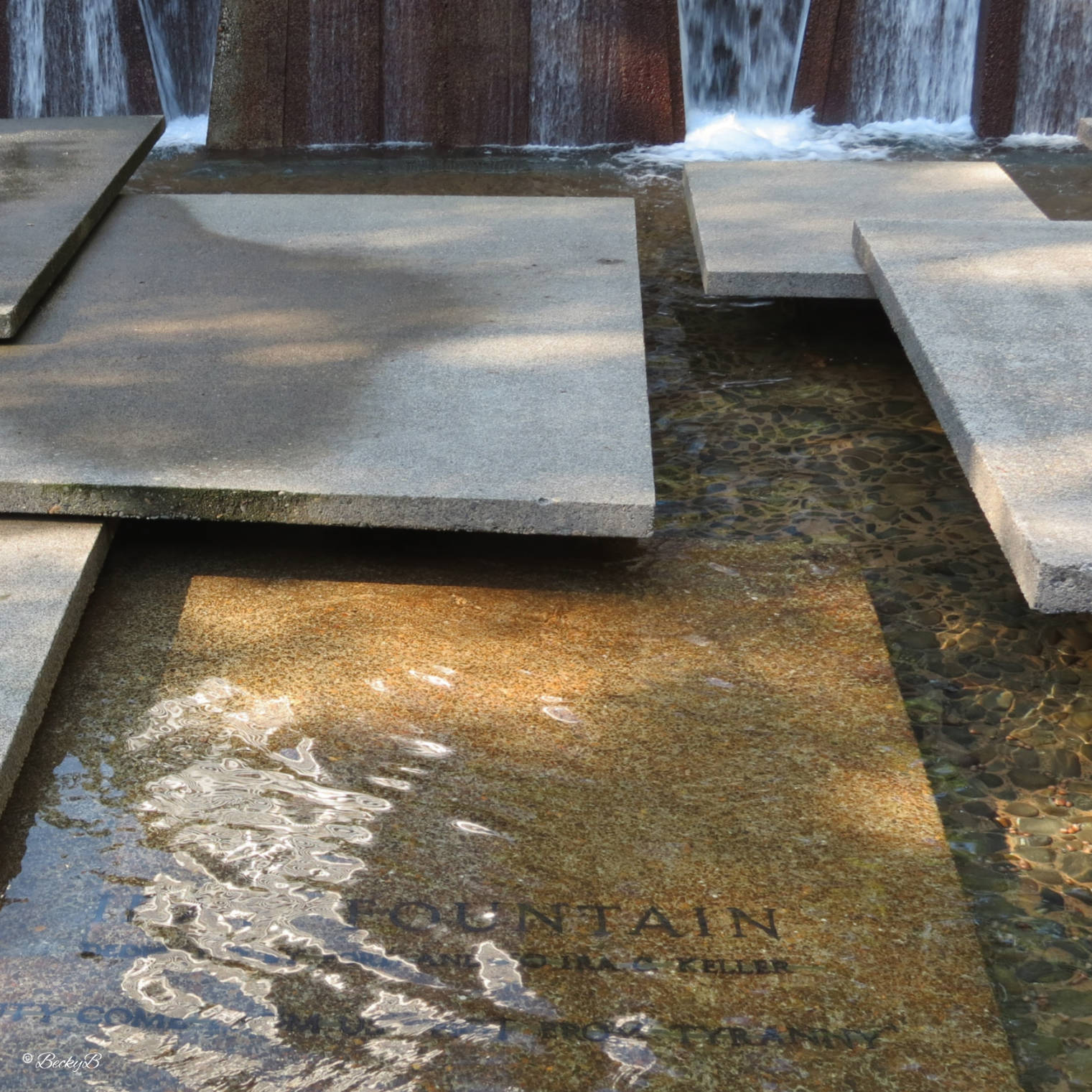 My title is taken from the quote hidden in the waters of this wonderful fountain. The quote seems very appropriate for the times we are living in, and the fountain is perfect for this month’s Squares Challenge as it brings squares, rectangles and geometry alive.